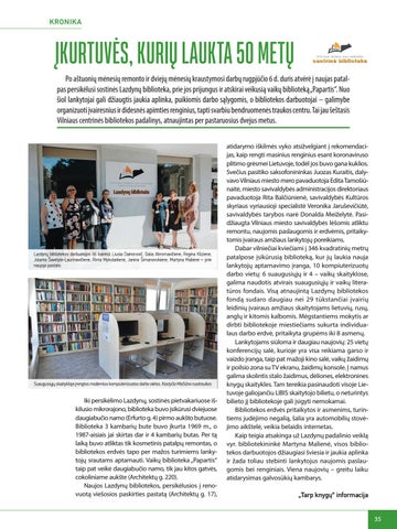 ĮKURTUVĖS, KURIŲ LAUKTA 50 METŲ Po aštuonių mėnesių remonto ir dviejų mėnesių kraustymosi darbų rugpjūčio 6 d. duris atvėrė į naujas patalpas persikėlusi sostinės Lazdynų biblioteka, prie jos prijungus ir atskirai veikusią vaikų biblioteką „Papartis“. Nuo šiol lankytojai gali džiaugtis jaukia aplinka, puikiomis darbo sąlygomis, o bibliotekos darbuotojai – galimybe organizuoti įvairesnius ir didesnės apimties renginius, tapti svarbiu bendruomenės traukos centru. Tai jau šeštasis Vilniaus centrinės bibliotekos padalinys, atnaujintas per pastaruosius dvejus metus.