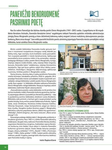 PANEVĖŽIO BENDRUOMENĖ PASIRINKO POETĘ Nuo šio rudens Panevėžyje dar dažniau skamba poetės Elenos Mezginaitės (1941–2005) vardas. Ji pagerbiama ne tik respub likinio literatūros festivalio „Panevėžio literatūrinė žiema“ nugalėtojams teikiant Panevėžio apskrities viršininko administracijos įsteigtą Elenos Mezginaitės premiją ar kone dešimtmetį kiekvieną rudenį rengiant Lietuvos moksleivių dainuojamosios poezijos konkursą„Mano senas drauge“. Savo veikla puoselėti kraštietės poetės atminimą įsipareigojo Panevėžio miesto savivaldybės viešoji biblioteka, kuriai suteiktas Elenos Mezginaitės vardas. Mintis suteikti bibliotekai Panevėžio krašte gimusio kul tūrai ir visuomenei nusipelniusio žmogaus vardą sklandė jau keletą metų. Ilgai svarstyta, kurio kraštiečio vardu pasivadinti. Tam nuspręsta pasitelkti ir miesto bendruomenę. Apklausoje panevėžiečių buvo prašoma rinktis iš šių asmenybių: rašytojo, pedagogo Motiejaus Lukšio, poetės Elenos Mezginaitės, kunigo, rašytojo Julijono Lindės-Dobilo, vaikų rašytojo Mato Grigonio, buvusio „Panevėžio balso“ redaktoriaus, rašytojo Konstantino Jasiukaičio. Taip pat buvo galima siūlyti kitus iškilius pane vėžiečius. Atsižvelgus į daugumos dalyvavusiųjų apklausoje nuomonę, išrinktas poetės E. Mezginaitės vardas. Žymių žmonių, istorinių datų ir įvykių įamžinimo Panevėžio mieste komisijos vienabalsiu pritarimu 2020 m. gegužės 28 d. posėdyje Panevėžio miesto savivaldybės taryba nusprendė savi valdybės viešajai bibliotekai suteikti poetės Elenos Mezginaitės vardą. Nuo rugsėjo 1 d. biblioteka oficialiai vadinama Panevėžio Elenos Mezginaitės viešąja biblioteka. Naują jos logotipą sukūrė bibliotekos dailininkė Nijolė Labanauskienė. „Pasivadindama poetės vardu biblioteka ne tik įamžina šios žymios kraštietės indėlį į Panevėžio kultūrinį gyvenimą, bet kar tu įsipareigoja skleisti ir puoselėti jos literatūrinį palikimą“, – taip šį pasikeitimą įvertino bibliotekos direktorė Loreta Breskienė. Biblioteka sieks priminti, o kai kam gal ir naujai pristatyti savitą poetės kūrybą, kurią vertino poetai Valdemaras Kukulas, Sigitas Geda, Jonas Strielkūnas, literatūros kritikai Vytautas Kubilius, Viktorija Daujotytė, mėgo kompozitoriai, pagal jos tekstus kūrę muziką. Daugeliui puikiai žinomos pagal E. Mezginaitės eilėraščius sukurtos populiarios dainos: „Baltas lino gyvenimas“, „Melodija“, „Dešimt žingsnių“, „Ne mano vestuvės“, „Mano senas drauge“ ir kt. Panevėžyje prabėgo didžioji dalis E. Mezginaitės profesinio ir kūrybinio gyvenimo. Nuo 1965 m. ji dirbo Panevėžio laikraščių redakcijose, daugelį metų vadovavo Panevėžio literatų būreliui, organizavo literatūrinius renginius, Aukštaitijos rajonų literatū ros konkursą „Lino žiedas“, buvo aktyvi ir matoma Panevėžio kultūrinio gyvenimo dalyvė. Poetė išleido keturias poezijos knygas: „Vasarų vieškeliais“ (1975), „Skardis“ (1982), „Provincijos tango“ (1989), „Šaltas ginklas“ (1999). Sudarė penkis eilėraščių rinkinius, parašė 10 pjesių, parengė kelis informacinius leidinius apie Panevėžio kraštą ir rajoną.