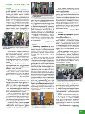 Vasariškas poezijos pavasaris. Neįprastu laiku – rugpjūčio 8-ąją – Radviliškio krašte sulau kėme „Poezijos pavasario 2020“. Šeštadienį šventę viešosios bibliotekos kie melyje muzikiniais kūriniais pradėjo kraštietė vokalistė Toma Pauraitė. Bibliotekos direktorė Violeta Šukaitienė sveikindama festivalio daly vius džiaugėsi jaunų kūrėjų gausa, rajono mero pavaduotojas Mindaugas Pauliukas dėkojo poetams, atveriantiems gaivinančias poetinio žodžio gelmes. Skambėjo jaunųjų kūrėjų eilės, jas skaitė poe tai Marija Mažulė, Toms Treibergs (Latvija), Laura Kromalcaitė, Simonas Bernotas, Tomas Petrulis. Prie jų kūrybos derėjo ir bardo Povilo Girdenio atliekami kūriniai. Renginiui pasibaigus dar buvo galima pabendrauti, apžiūrėti bibliotekos parengtą literatūros parodą „Atkurtos Lietuvos „Poezijos pavasarių“ laureatai“.