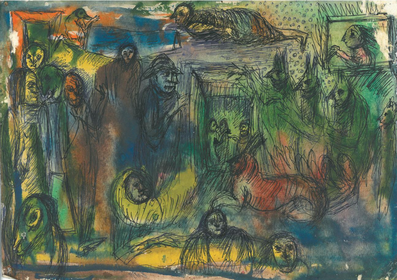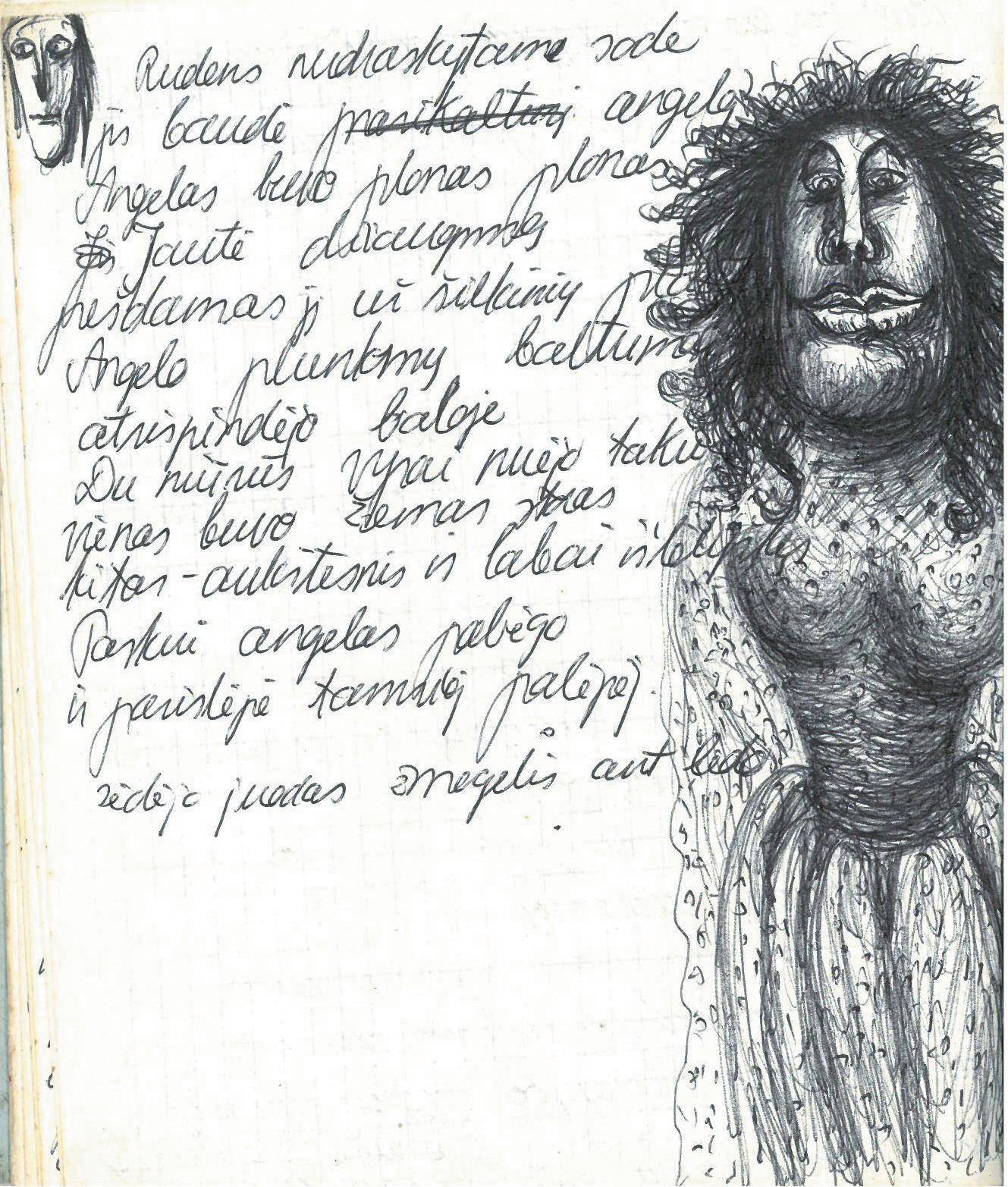 J. Skablauskaitės piešiniai pasižymi tais pačiais bruožais kaip ir romanai– yra fragmentiški, ekspresyvūs, kupini fantasmagoriškų būtybių.