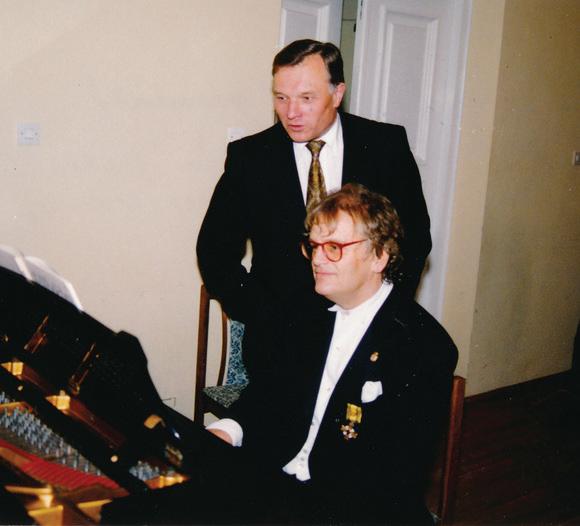 P. Bingelis (stovi) su žymiu vokiečių pianistu, dirigentu J. Frantzu. Vilnius, 1994 m. Publikuota LIMIS (© Kauno miesto muziejus, KMM F 4842)