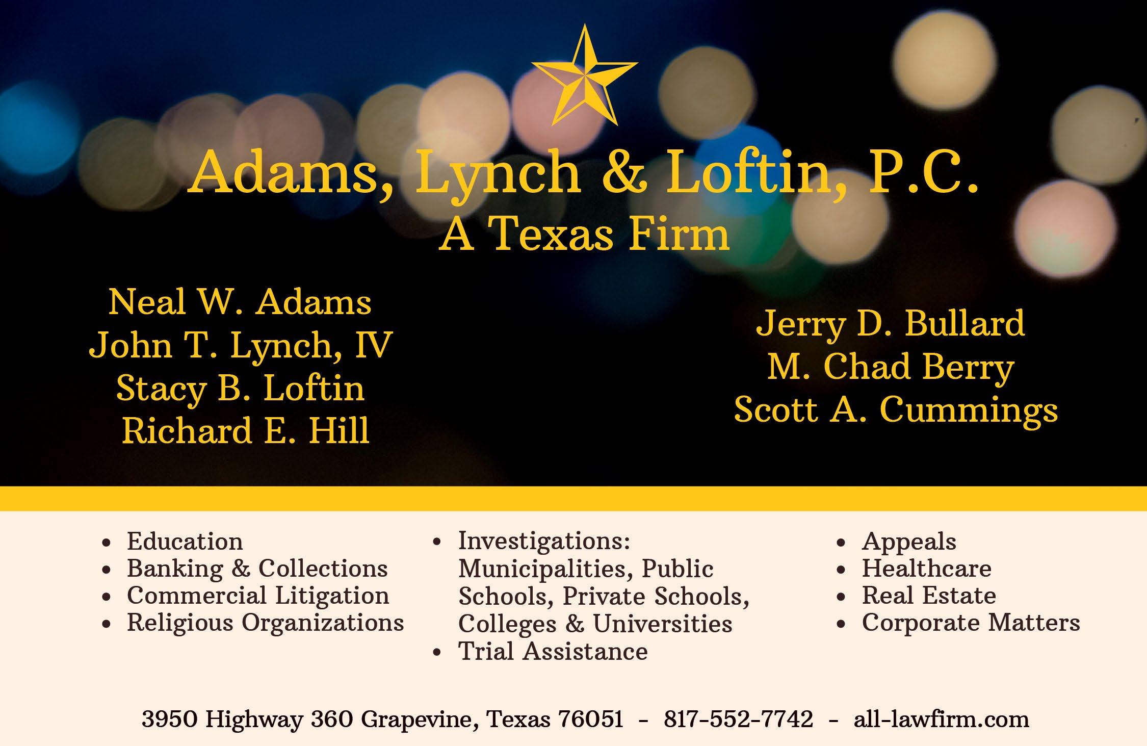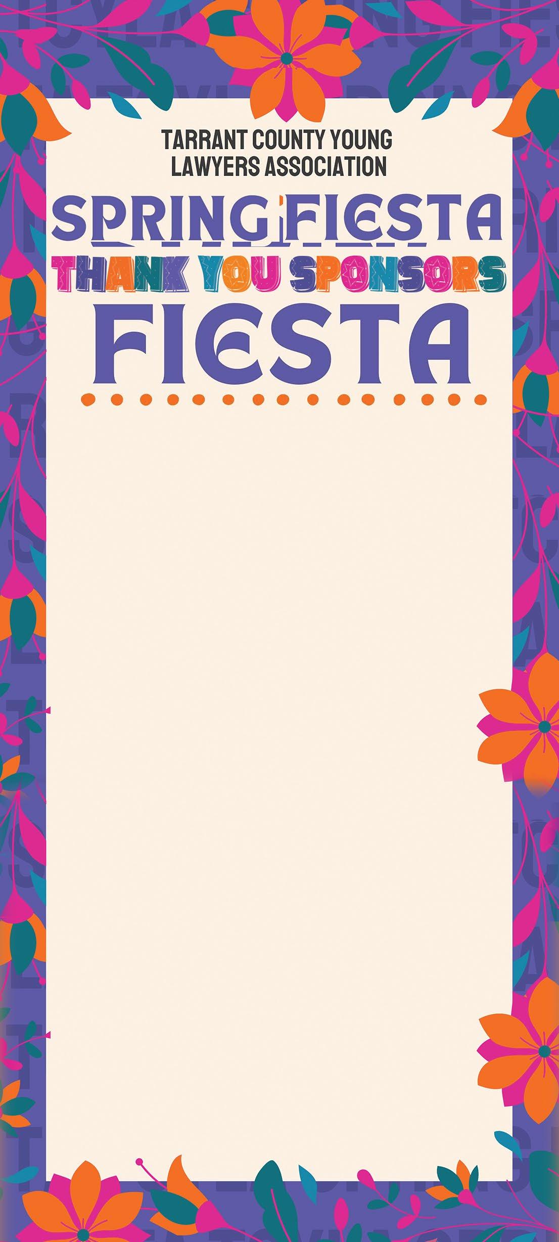 published in the Bar Bulletin do not necessarily reflect the opinions of the Tarrant County Bar Association, its officers or the Board of Directors. Advertisements and feature articles should not be considered an endorsement of any service, product, program, seminar or event.
