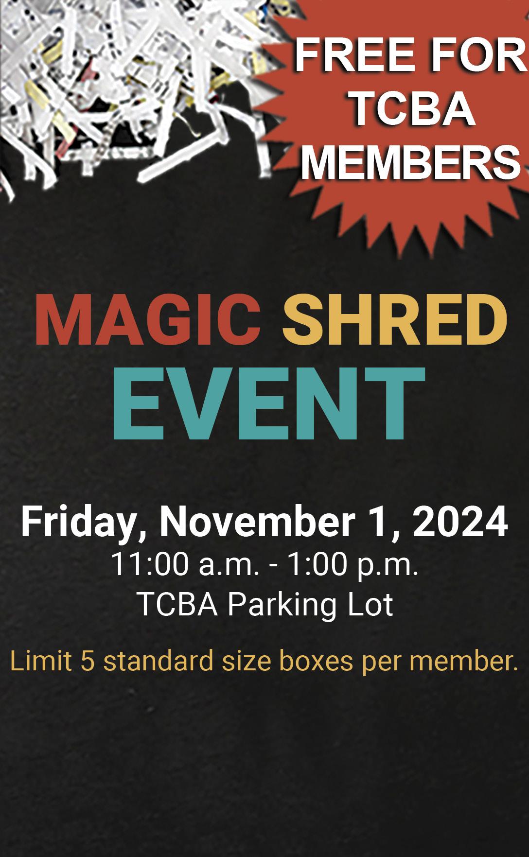 Magic Shred is a secure shredding business that offers TCBA members a 10% discount to TCBA members. They provide on-site document shredding services. TCBA also organizes 4 free shredding events per year exclusively for its members. Members can bring up to five boxes for shredding free of charge. Call 940.783.6580 for details. g