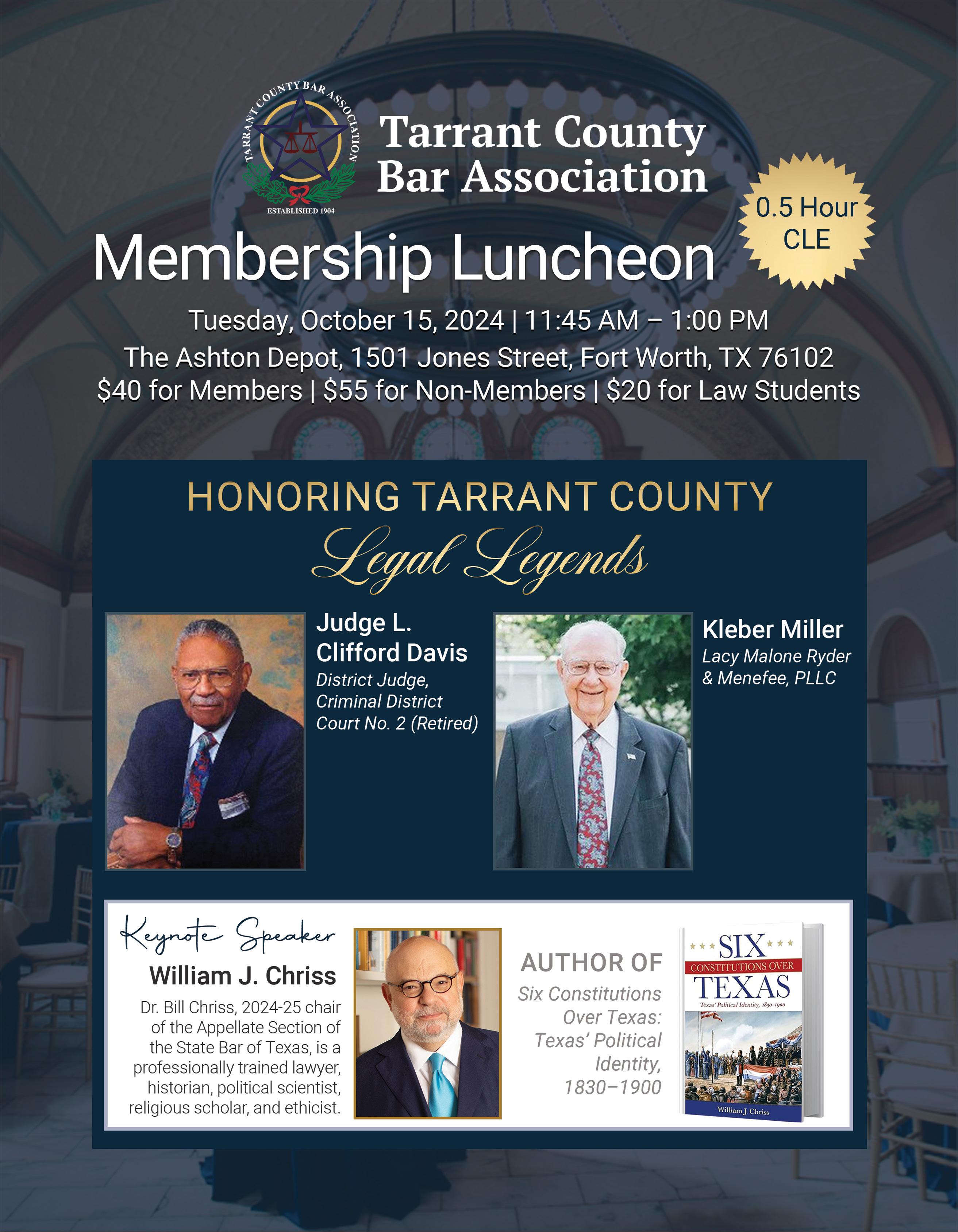 Fall is also a busy time for the TCBA. In October, look for “Masters of the Bench and Bar: Conversations with Tarrant County Legal Greats.” That event will be October 11 from 12-5 p.m. at the TCBA offices for only $25 for members. Do not miss this chance to learn from and laugh with some of the best lawyers Tarrant County has known. The following week, please attend the October membership luncheon where we will honor Hon. L Clifford Davis and Kleber Miller as the first Tarrant County Legal Legends, a status they unquestionably deserve but that very few will ever achieve. Judge Davis and Mr. Miller deserve all the praise we can give them.