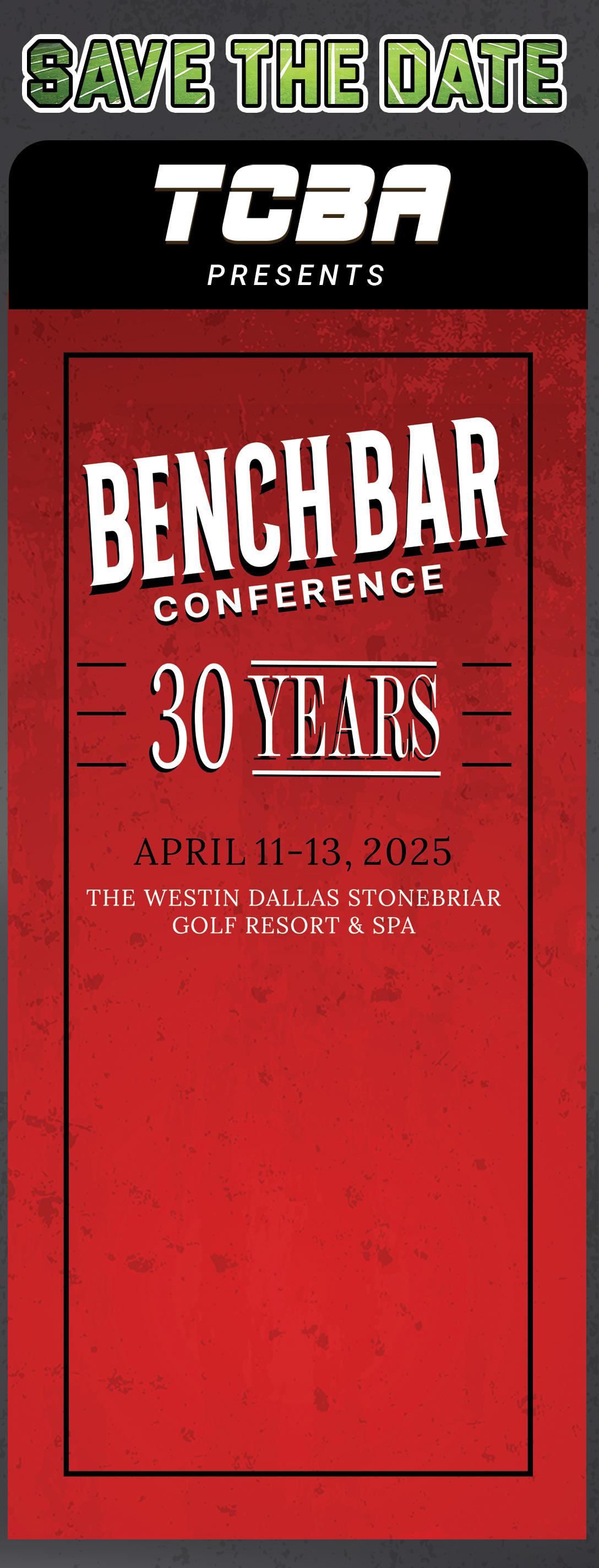As we move into Fall and begin to reflect on 2024, let’s get involved and be thankful for those who led us from the past to the present and for the opportunities we each have to benefit from the TCBA. g
