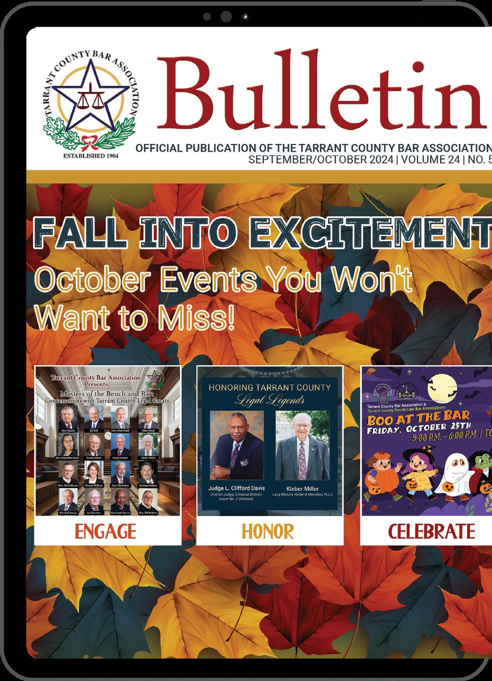 the new bar year. Any firm/organization that qualifies in the future will have its name published in every issue of the Bar Bulletin for this bar year. TCBA takes pride in the participation of these law firms and other groups. The new bar year began on July 1. If you have not paid your renewal invoice, please contact Tiffany Myles at tiffany@tarrantbar.org. g