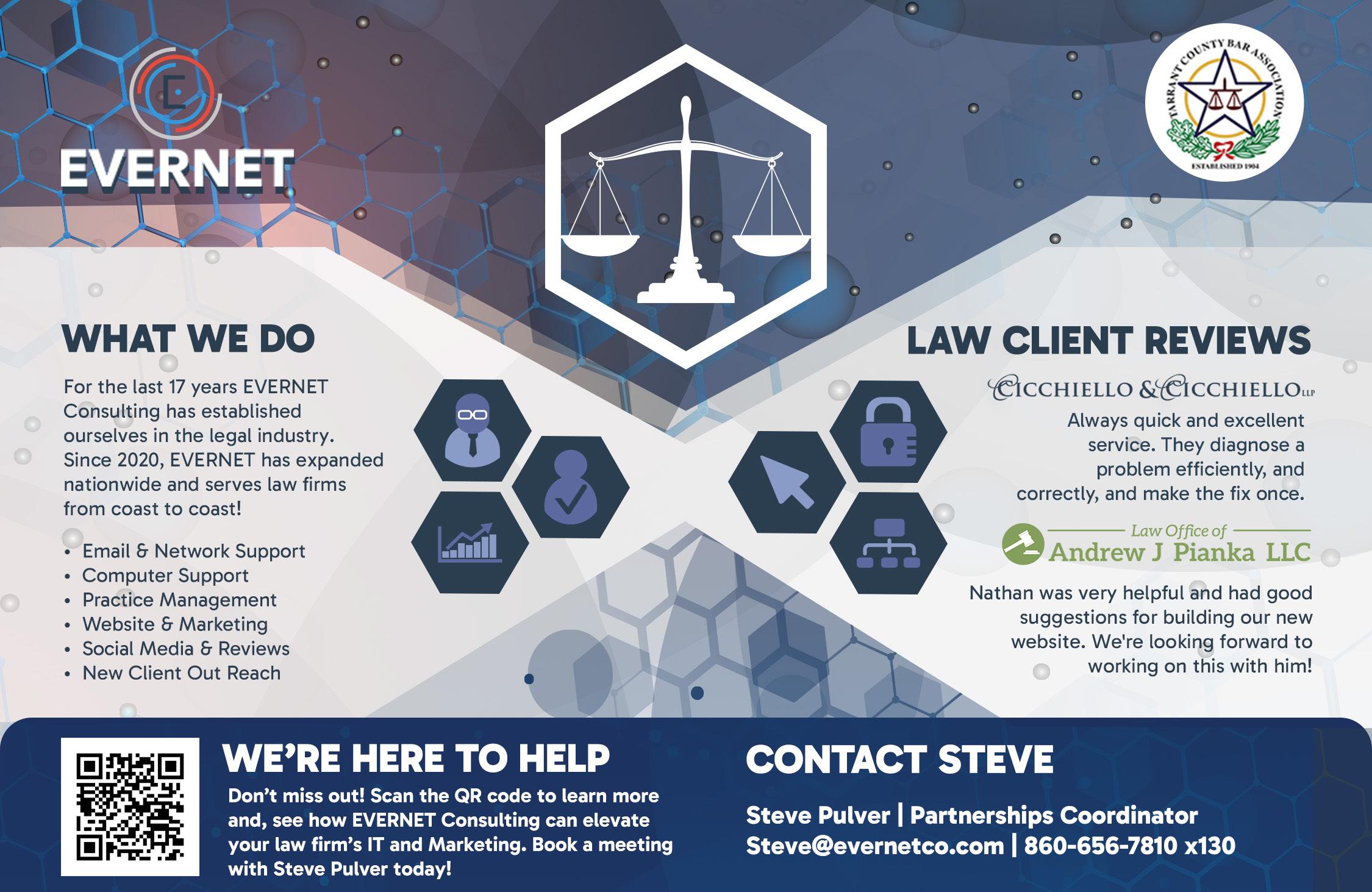 For the last 17 years EVERNET Consulting has been established in the legal industry, growing nationwide to support law firms across the country. Our wide range of services include email, network, and computer support, as well as practice management solutions. Our expertise also extends to website development, marketing, social media management, online reviews, and new client outreach. Contact us today and receive a discount on our services: https://evernetco.com/lp/tarrant-county-form/.