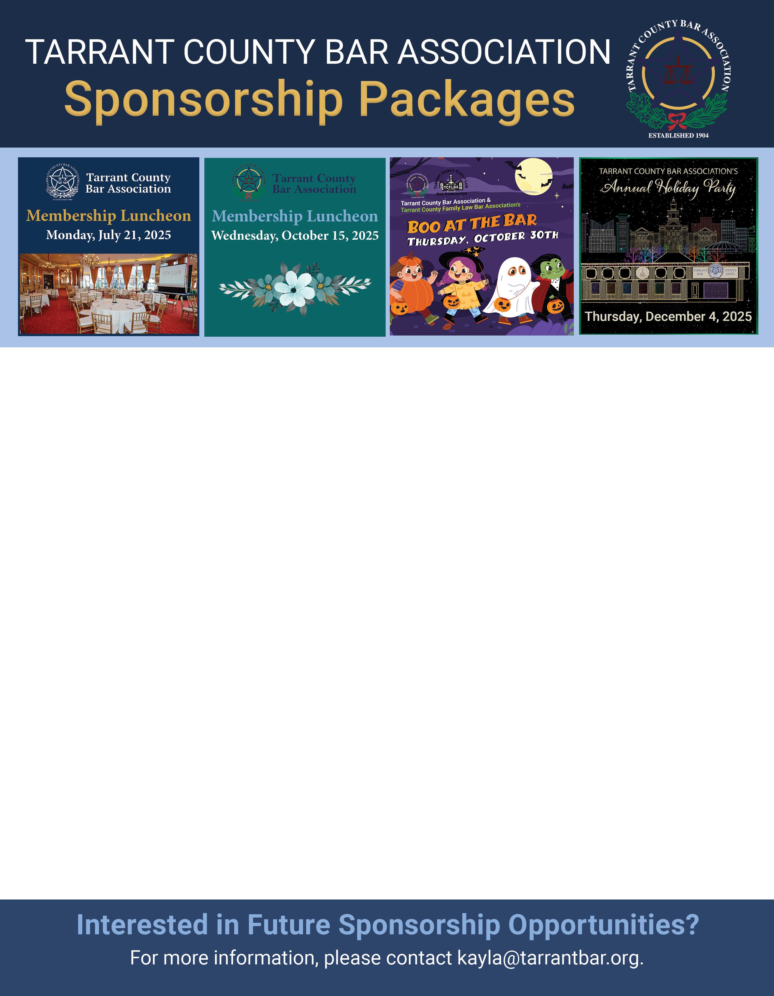 TIER 1 - 3 1/2 page ads in Bar Bulletin, recognition at the events and publicized on TCBA’s website, in the Bar Bulletin, and on TCBA’s social media.