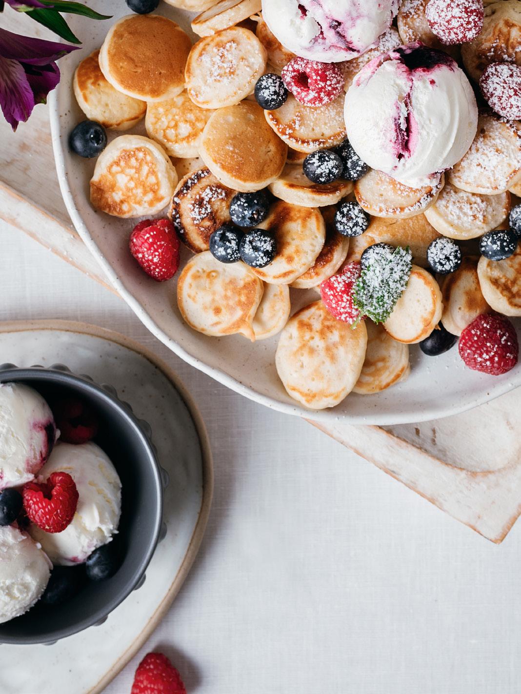 Pannkookide valmistamiseks kuumuta piim käesoojaks ja vala suhkruga vedelaks hõõrutud pärmile. Klopi sekka muna ja kardemon ning sõelu sekka soolaga segatud jahu. Sega ühtlaseks, kata kauss toidukilega ja lase umbes 45 minutit soojas kohas kerkida, kuni tainas on paksenenud ja õhumullidega. Kuumuta pann keskmise kuumuse juures, määri kergelt võiga ja tõsta teelusika abil pannile väikesed tainakuhjad. Kõige lihtsam on seda teha spetsiaalset minipannkookide panni kasutades, kuid ka harilik pann sobib. Lase minuti-paari jooksul kuldpuuniks küpseda, seejärel keera hambatiku abil koogid ümber ja küpseta ka teiselt poolt. Jätka, kuni tainas on otsa saanud. Lao pannkoogid vaagnale või taldrikutele, lisa jäätisepallid ja marjad ning puista üle tuhksuhkruga.