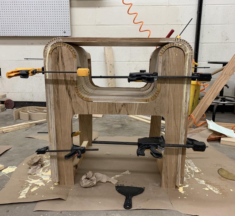 After several trial and error experiments, we discovered that the wood bends with more ease while damp and results in less cracking, and only glue was necessary to hold the nightstand together.