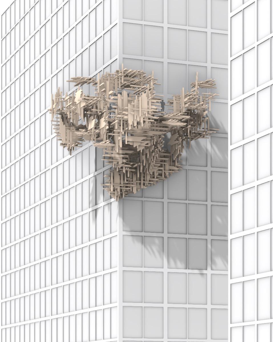 Air rights laws in the future have relaxed allowing these cities to conitine to grow, so that more air space can be utilized as land space become more and more limited. People can implement a new building technique using wood members that slide and interlock with each other and are lightweight enough to expand and cantilever off of the buildings. This technique allows people to build expanson that are more suited to their changing lifestyles.