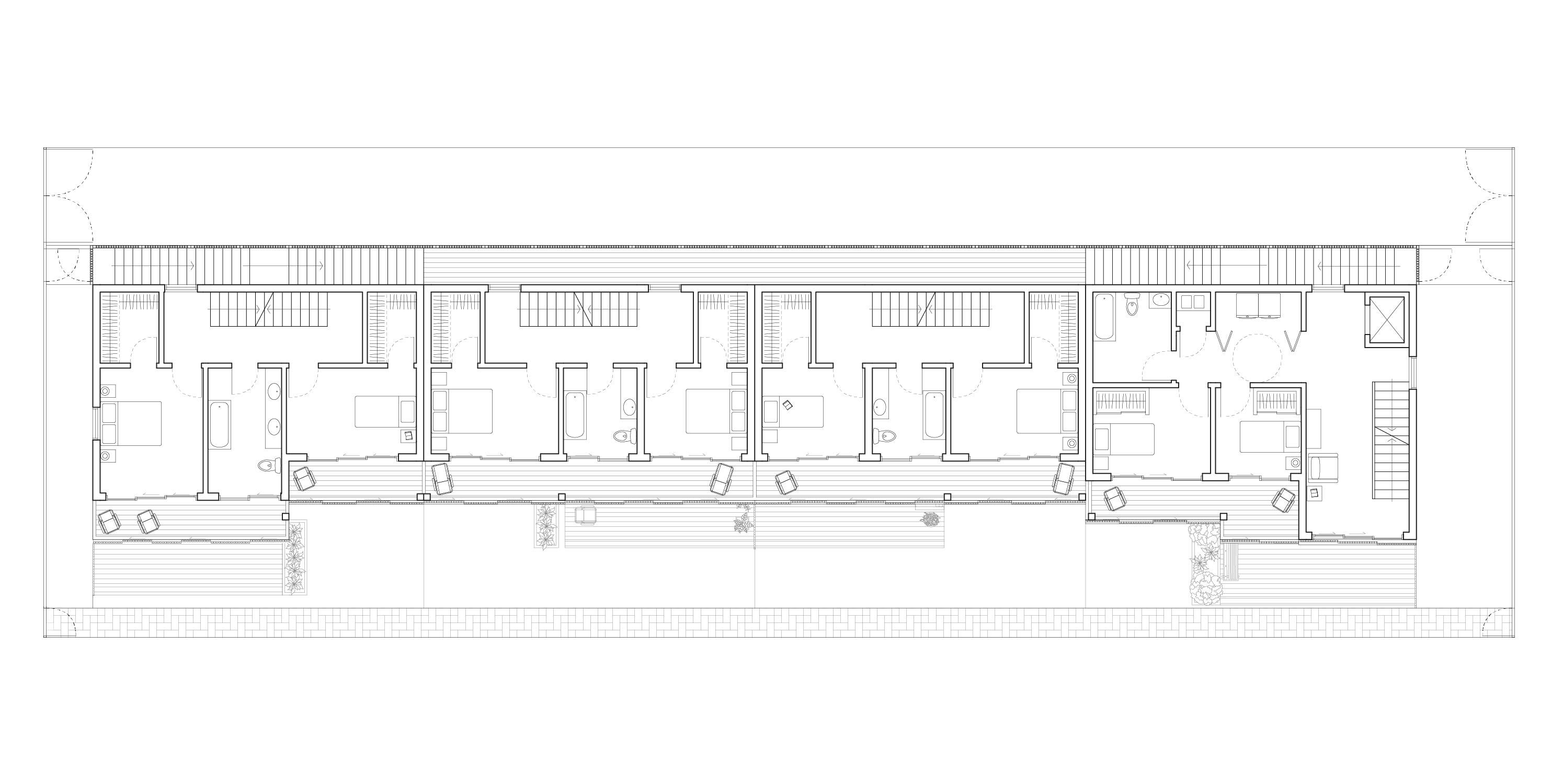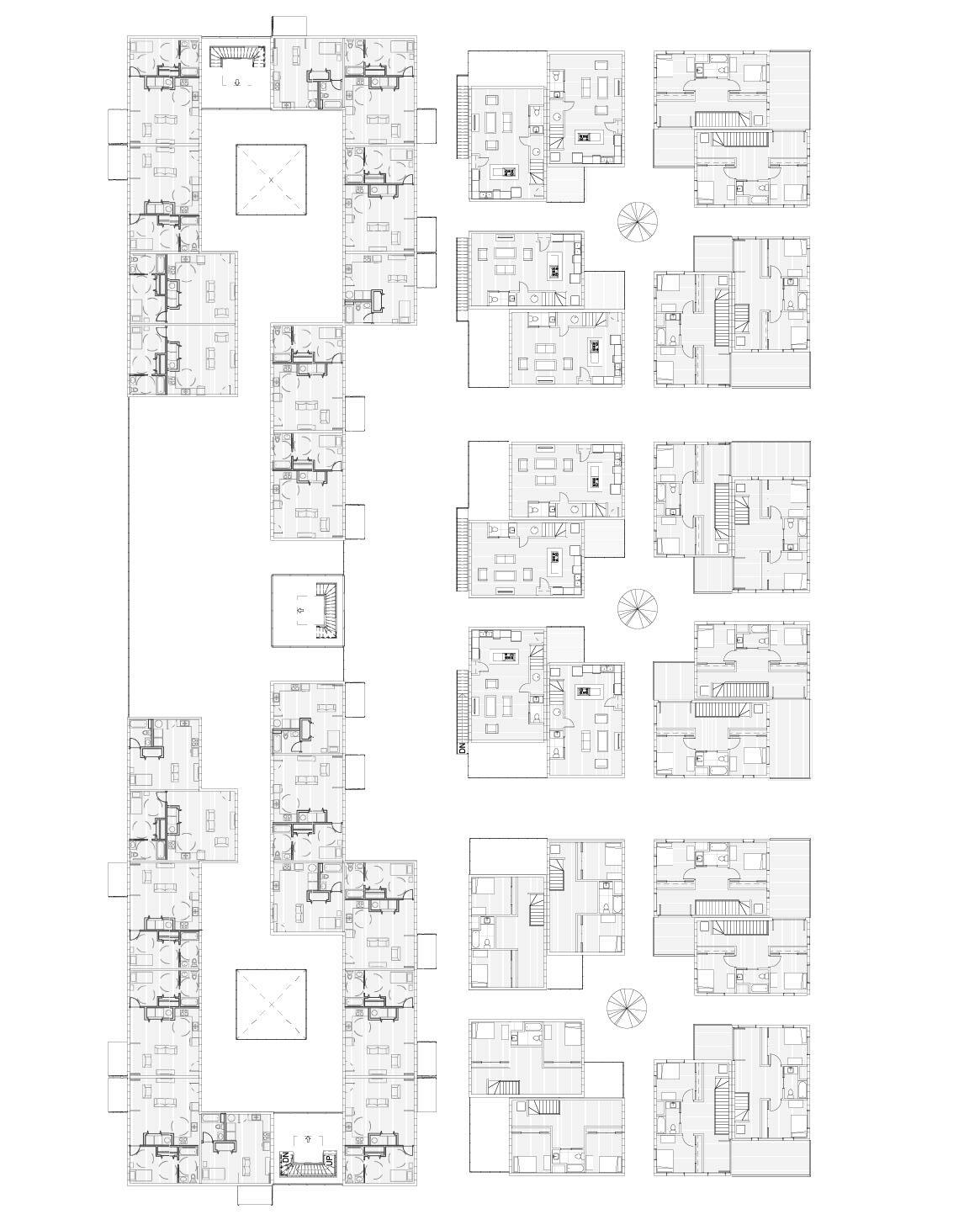 Additionally, the top floors maximize balcony spaces to provide more private opportunities for outside experience per dwelling, and the top dwellings access a shared roof terrace to compensate for their lack of occupancy on the ground green spaces.