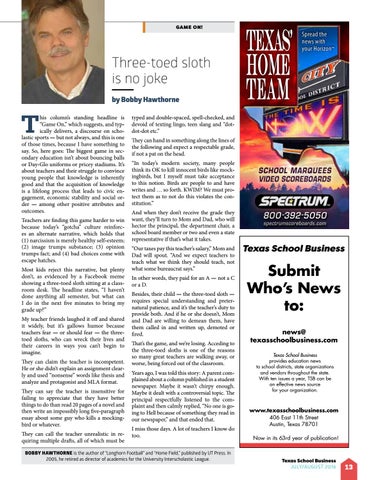 his column’s standing headline is “Game On,” which suggests, and typically delivers, a discourse on scholastic sports — but not always, and this is one of those times, because I have something to say. So, here goes: The biggest game in secondary education isn’t about bouncing balls or Day-Glo uniforms or pricey stadiums. It’s about teachers and their struggle to convince young people that knowledge is inherently good and that the acquisition of knowledge is a lifelong process that leads to civic engagement, economic stability and social order — among other positive attributes and outcomes. Teachers are finding this game harder to win because today’s “gotcha” culture reinforces an alternate narrative, which holds that (1) narcissism is merely healthy self-esteem; (2) image trumps substance; (3) opinion trumps fact; and (4) bad choices come with escape hatches. Most kids reject this narrative, but plenty don’t, as evidenced by a Facebook meme showing a three-toed sloth sitting at a classroom desk. The headline states, “I haven’t done anything all semester, but what can I do in the next five minutes to bring my grade up?” My teacher friends laughed it off and shared it widely, but it’s gallows humor because teachers fear — or should fear — the threetoed sloths, who can wreck their lives and their careers in ways you can’t begin to imagine. They can claim the teacher is incompetent. He or she didn’t explain an assignment clearly and used “nonsense” words like thesis and analyze and protagonist and MLA format. They can say the teacher is insensitive for failing to appreciate that they have better things to do than read 20 pages of a novel and then write an impossibly long five-paragraph essay about some guy who kills a mockingbird or whatever. They can call the teacher unrealistic in requiring multiple drafts, all of which must be