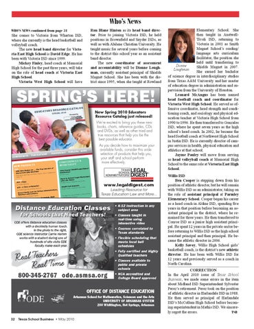 Elementary School. She then taught in AustwellTivoli ISD, returning to Victoria in 2001 as Smith Magnet School’s reading/ language arts curriculum facilitator, the position she held until transferring to Dionne Shields Magnet in 2007. Loughman She earned her bachelor of science degree in interdisciplinary studies from Texas A&M University and her master of education degree in administration and supervision from the University of Houston. Leonard McAngus has been named head football coach and coordinator for Victoria West High School. He served as offensive coordinator, head strength and conditioning coach, and sociology and physical education teacher at Victoria High School from 1990 to 1996. He then transferred to Gonzales ISD, where he spent seven years as the high school’s head coach. In 2002, he became the head football coach at Northwest High School in Justin ISD. He is currently director of campus services in health, physical education and athletics at that school. Jayme Pauley will move from serving as head volleyball coach at Memorial High School to the same role at Victoria East High School. Willis ISD Ben Cooper is stepping down from his position of athletic director, but he will remain with Willis ISD as an administrator, taking on the role of assistant principal at Parmley Elementary School. Cooper began his career as a head coach in Aldine ISD, spending five years in that position before becoming an assistant principal in the district, where he remained for three years. He then transferred to Conroe ISD as a junior high assistant principal. He spent 12 years in the private sector before returning to Willis ISD as the high school assistant principal and then principal. He became the athletic director in 2006. Kelly Savoy, Willis High School girls’ basketball coach, is the district’s new athletic director. He has been with Willis ISD for 12 years and previously served as a coach in North Carolina. CORRECTION In the April 2010 issue of Texas School Business, we made some errors in the item about Midland ISD Superintendent Sylvester Perez’s retirement. Perez took on the position of athletic director in Harlandale ISD in 1988. He then served as principal of Harlandale ISD’s McCollum High School before becoming superintendent in Mathis ISD. We sincerely regret the errors. TSB