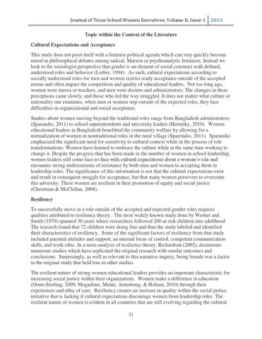 Journal of Texas School Women Executives, Volume II, Issue 1 2013 Topic within the Context of the Literature Cultural Expectations and Acceptance This study does not posit itself with a feminist political agenda which can very quickly become mired in philosophical debates among radical, Marxist or psychoanalytic feminists. Instead we look to the sociologist perspective that gender is an element of social construct with defined, understood roles and behavior (Lorber, 1994). As such, cultural expectations according to socially understood roles for men and women restrict ready acceptance outside of the accepted norms and often impact the competition and quality of educational leaders. Not too long ago, women were nurses or teachers, and men were doctors and administrators. The changes in these perceptions came slowly, and those who led the way struggled. It does not matter what culture or nationality one examines, when men or women step outside of the expected roles, they face difficulties in organizational and social acceptance. Studies about women moving beyond the traditional roles range from Bangladesh administrators (Sparandio, 2011) to school superintendents and university leaders (Hernetky, 2010). Women educational leaders in Bangladesh benefitted the community welfare by allowing for a normalization of women in nontraditional roles in the rural village (Sparendio, 2011). Sparandio emphasized the significant need for sensitivity to cultural context while in the process of role transformations. Women have learned to embrace the culture while at the same time working to change it. Despite the progress that has been made in the number of women in school leadership, women leaders still come face-to-face with cultural expectations about a woman’s role and encounter strong undercurrents of resistance by both men and women to accepting them in leadership roles. The significance of this information is not that the cultural expectations exist and result in consequent struggle for acceptance, but that many women persevere to overcome this adversity. These women are resilient in their promotion of equity and social justice (Christman & McClellan, 2008). Resiliency To successfully move in a role outside of the accepted and expected gender roles requires qualities attributed to resiliency theory. The most widely known study done by Werner and Smith (1979) spanned 30 years where researchers followed 200 at-risk children into adulthood. The research found that 72 children were doing fine and thus the study labeled and identified their characteristics of resiliency. Some of the significant factors of resiliency from that study included parental attitudes and support, an internal locus of control, competent communication skills, and work ethic. In a meta-analysis of resilience theory, Richardson (2002), documents numerous studies which have replicated the original research with similar outcomes and conclusions. Surprisingly, as well as relevant to this narrative inquiry, being female was a factor in the original study that held true in other studies. The resilient nature of strong women educational leaders provides an important characteristic for increasing social justice within their organizations. Women make a difference in education (Oram-Sterling, 2009; Mogadime, Mentz, Armstrong, & Holtam, 2010) through their experiences and ethic of care. Resiliency creates an increase in quality within the social justice initiative that is lacking if cultural expectations discourage women from leadership roles. The resilient nature of women is evident in all countries that are still evolving regarding the cultural 31