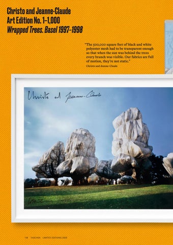 Christo and Jeanne-Claude Art Edition No. 1–1,000 Wrapped Trees. Basel 1997–1998 “ The 500,000 square feet of black and white polyester mesh had to be transparent enough so that when the sun was behind the trees every branch was visible. Our fabrics are full of motion, they’re not static.” Christo and Jeanne-Claude