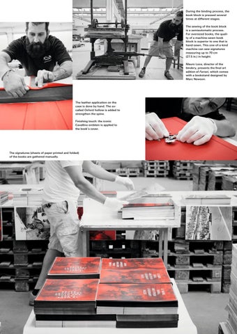 During the binding process, the book block is pressed several times at different stages. The sewing of the book block is a semiautomatic process. For oversized books, the quality of a machine-sewn book block is s uperior to one that is hand-sewn. This one-of-a-kind machine can sew signatures measuring up to 70 cm (27.5 in.) in height. Mauro Loce, director of the bindery, presents the final art edition of Ferrari, which comes with a bookstand d esigned by Marc Newson.