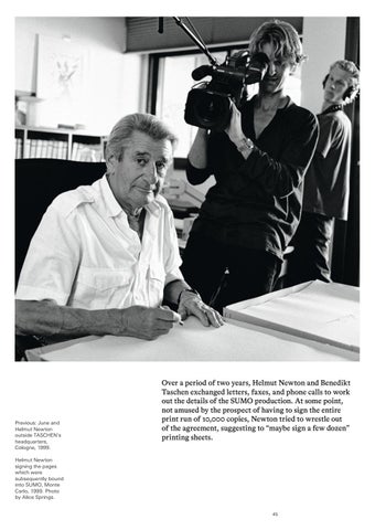 Helmut Newton signing the pages which were subsequently bound into SUMO, Monte Carlo, 1999. Photo by Alice Springs. 45