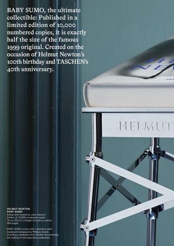 HELMUT NEWTON. BABY SUMO Edited and revised by June Newton Edition of 10,000 numbered copies 74 cm (29.2 in.) (height of book on stand) 464 pages BABY SUMO comes with a stainless-steel bookstand designed by Philippe Starck, including a pedestal and a booklet documenting the making of this legendary publication.