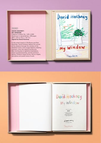 SUMO DAVID HOCKNEY. MY WINDOW Collector’s Edition No. 1,001–2,000 Hardcover in clamshell box, 248 pages 38.5 × 50 cm (15.2 × 19.7 in.) Signed by David Hockney In this artist’s book of 120 iPhone and iPad drawings, David Hockney follows the course of the seasons through the window of his Yorkshire home. Each image depicts a fleeting moment—from the colorful sunrise and lilac morning sky to nighttime impressions, snow-covered branches, and the arrival of spring. Printed in large format, this is a highly perceptive and poetic body of work.