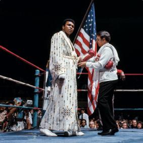Jeff Koons and Will Smith celebrating the launch of GOAT with Muhammad Ali at the Miami Beach Convention Center, 2003.