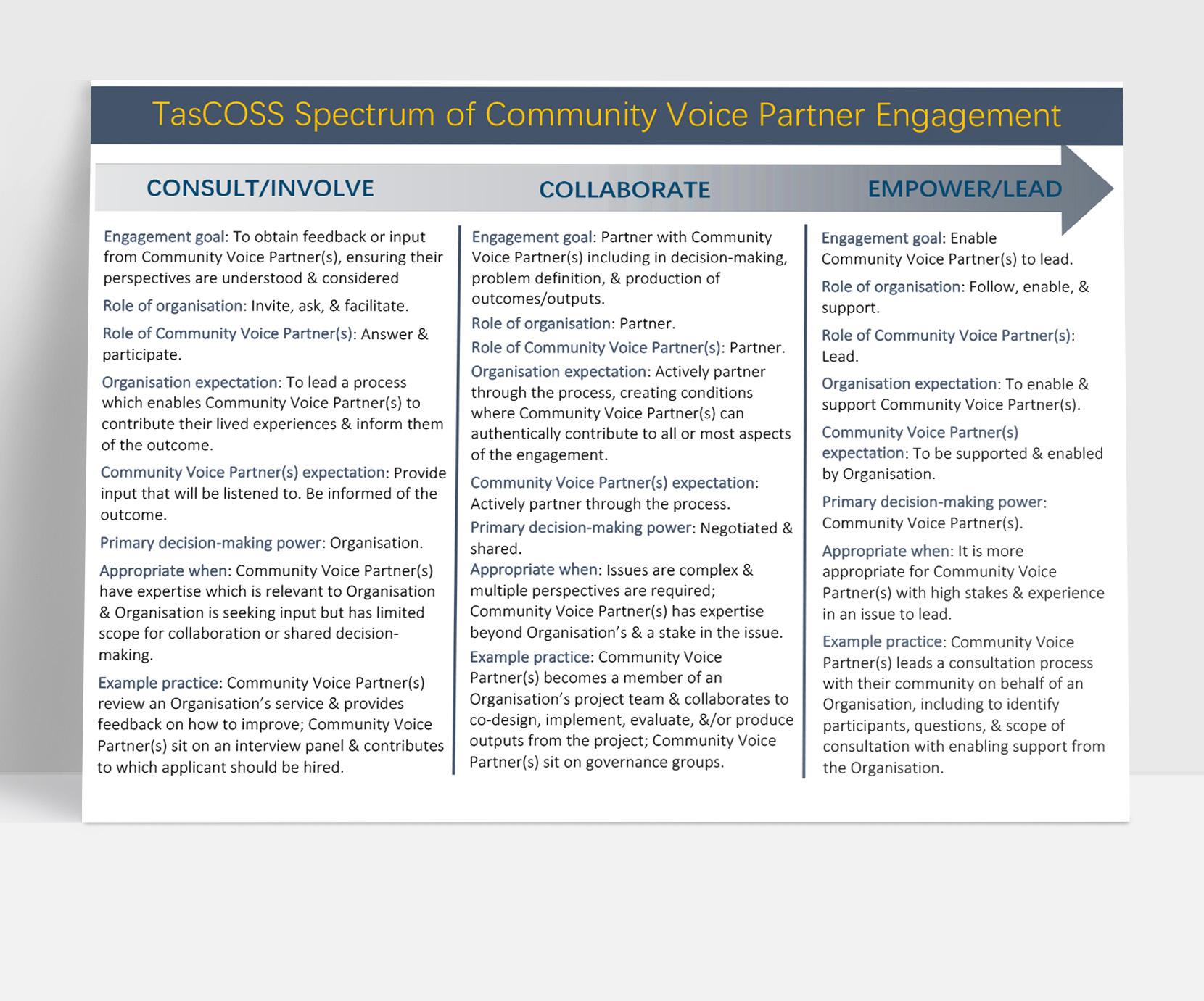 You are clear on your role in the engagement according to the TasCOSS Community Voice Partner Engagement Spectrum above and understand the details as outlined in the Organisational request form given to you.