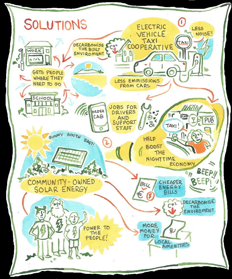 The solutions identified and researched in detail are an electric vehicle taxi co-operative and community-owned solar energy. These specific solutions are designed to meet the need for climate action whilst also being realistic and beneficial for the Enniscorthy. They provide a blueprint for how the People’s Transition Model might be applied in a specific context.