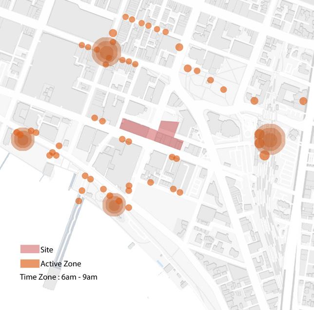 Activity mapping reveals peak usage during commutes and lunch hours, highlighting opportunities to introduce functions that enhance site activation and public space vibrancy throughout the day.