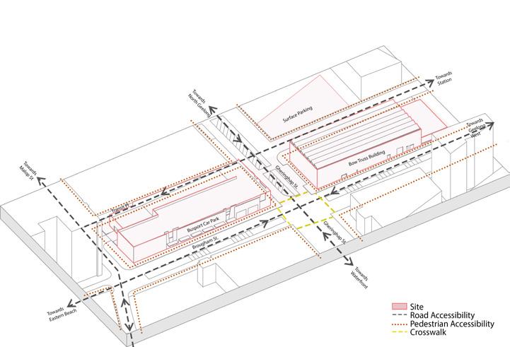 The removal of the internal roadway creates a continuous ground plane, rerouting traffic to enhance pedestrian connectivity and spatial integration between the Denny Lascelles Building and bus port site.