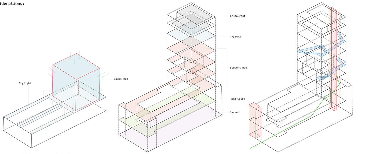 An integrated system of ramps, lifts, and stairs ensures seamless connectivity across floors, enhancing accessibility and flow between market spaces, student hubs, and cultural venues.