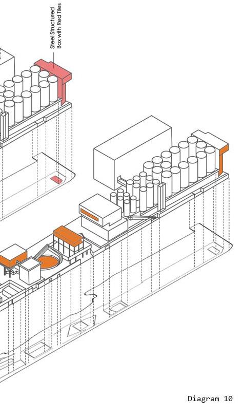 -Removal of three tanks on the roof of D4 to create space for an open-air theater surrounded by high silos.