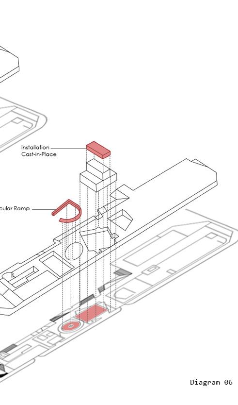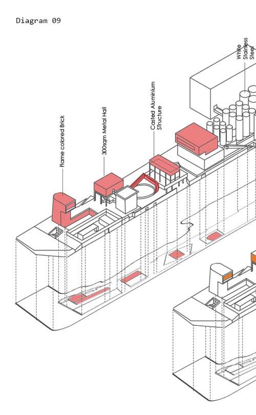 Figure 16: Removal of a Silo (Source: ilia, e. ( 2022, january 28). Designboom. Retrieved from https://www.designboom.com/architecture/urbanus-renovates-brewery-into-an-urbanistic-cultural-stage-in-shenzhen-01-28-2022/) Figure 17: Exhibition Space under the silos (Source: "Kingway Brewery Renovation / URBANUS" 22 Mar 2023. ArchDaily. Accessed 22 Mar 2024. <https://www.archdaily.com/998283/kingway-brewery-renovation-urbanus> ISSN 0719-8884) Diagram 08: Building D - Interior SpaceKingway Brewery Renovation, Urbanus Overview