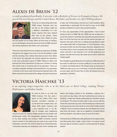 advice and finding comfort in our similarities, realizing that I too could one day make a life out of performing and using my creativity. I made new friends, particularly the wonderful Jeanie Cunningham ’75, whom I’ve been able to stay in touch with this whole time and share my music. Her friendship has meant a lot to me because she came into my life at a time when I really needed a “Big Sis,” and in moments of doubt, she has helped me in more ways than she knows. I also am so grateful to Jonathan Morris and Kay Hamblin. I was able to learn so much from them. I look back at my TASIS years with gratitude for the opportunities and discoveries that I made. I got to learn a lot about myself and was able to become a part of a community that I’ll always cherish. 42