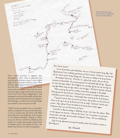Dear Francis’ parents! I am one of mountaineer s from Uzbekistan, wh o were at Everest moun My friends and I were tain during May 1998. involuntary eyewitnesse s of Francis accident. who saw Francis and he Furthermore I was the r husband Sergey alive last, . Our group was climbin We had found Francis g to the top of Everes near “First Step” on a t. ridge of the mountain. unconscious and frost-bit She was alive but ten. Our previous grou p gave her all possible her their last oxigen cil he lp last day. They gave inders. But all efforts were unavailing. By th very high altitude durin is time she was being ata g two days without a te nt and oxygen. This le Please accept my deep ad s to death for all people and true condolence and . epression of sympaty to Returning from the top Your family. of Everest, I had foun d a few cassettes at a I pickedthem up just to heoght of 8600 meters make shure. I had deve . loped these cassettes by To my great surprise the end of last year. these were pictures of Francis. Some of them Francis on the way to were the pictures of the top of Everest and at the top itself. I unde pictures. They confirm rstood I had the unique ed Francis had climbed to the top of Everest Furthermore these we wi thout oxygen. re the last pictures of Francis. I send them via Americ an embassy in Uzbekist an, because I don’t know use them by your own Your address. Please discretion. I also send Yo u Francis’ tent. It was neering camps on the rid fo un d in one of mountaige. We had realized it belonged to Francis. T questioning of a lot of hi s wa people. s established by If you need any informa tion concerning this expe dition, please don’t hesit Syncerely yours ate to contact me. Ilyas Thkhvatullin