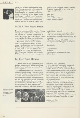 MCF, A Very Special Person From thè moment that I first saw Mrs. Fleming driving up in her little Mini to collect me for my interview as a candidate for a position at TASIS HELLENIC International School, I have never ceased to feel like a very special person working for a very special organization. Her concern for all of us who work for TASIS has been demonstrated in so many caring ways. Images and experiences abound: MCF cooking breakfast for us, a telephone cali at home to say, “I love you and think that everyone at HELLENIC is doing a terrifìc job!” On a recent whirlwind visit to Athens MCF put in fourteen-hour days to support thè