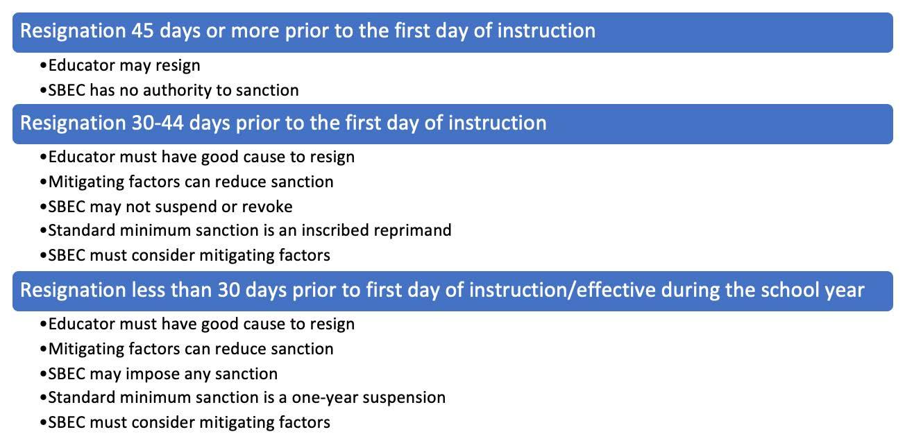 Prior to the 2021 change in law and the 2022 revision of SBEC rules, SBEC required a mandatory minimum sanction of a one year suspension for any educator who resigned within 45 days of the start of school without good cause or mitigating factors. SBEC could—but was not required to—consider mitigating factors. Now, consideration of those factors is mandatory and could lead to a suspended sanction, or to no sanction or disciplinary action at all.17