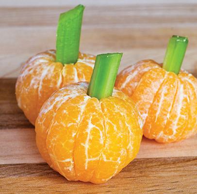 Orange pumpkin treats: Peel skin from oranges but keep the fruit intact and whole. Push a small piece of celery or other green vegetable into the top of each orange to create stems. Arrange festively on a platter. ●
