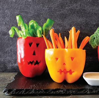 Carve eyes, noses, and mouths into peppers to create faces. Stuff with sliced vegetables and your favorite dip.