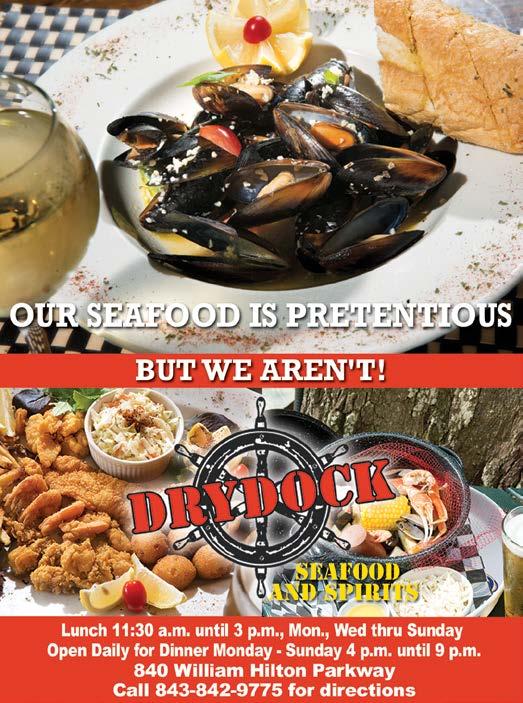 Home of “The” Carolina Crab Cake, “C3” at Palmetto Bay Marina is the spot to anchor! C3 is revered for its steaming shellfish boils, amazing seafood, steaks, and fresh daily oyster selections. But it is “The” Carolina Crab Cake that will have you planning another visit after your first bite. Don’t miss the Boom Boom Shrimp, Crab-stuffed Flounder, and Lowcountry Seafood (continued on page 14)