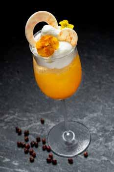 BY JIN LAO As day turns to night, The Ritz-Carlton Bar & Lounge transforms into an exciting evening destination featuring a refreshing gin and tonic menu, classic cocktails, and signatures like the Macau Red Bean Fleecy. Guests discover an entirely different drinking experience with the new Refined Essences Cocktail Menu, designed to excite the palate. Eight luxurious craft drinks, incorporating ingredients both sweet and savory, take inspiration from award-winning culinary delights inspired by The Ritz-Carlton, Macau. East meets West in the Complextini, a layered concoction that evokes the nourishing umami notes of Cantonese doubleboiled soup. Based on a classic vodka martini, it highlights conpoy and morels, elevated further by the gentle aroma of shiso. The Macau Red Bean Fleecy is a nostalgic vodka-based expression of red bean ice, the traditional Cantonese dessert drink commonly served in cha chaan tengs. Japanese azuki beans are restructured with molecular gastronomy techniques and paired with rose, Earl Grey gin, coconut milk, and more.