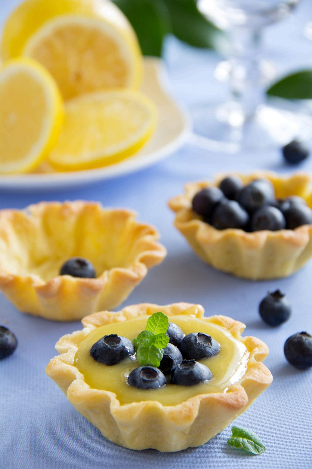 A buttery, golden crust filled with silky, tangy lemon curd and topped with a burst of sweet, juicy blueberries Finished with a light dusting of zest for the perfect balance of citrus and berry flavors.