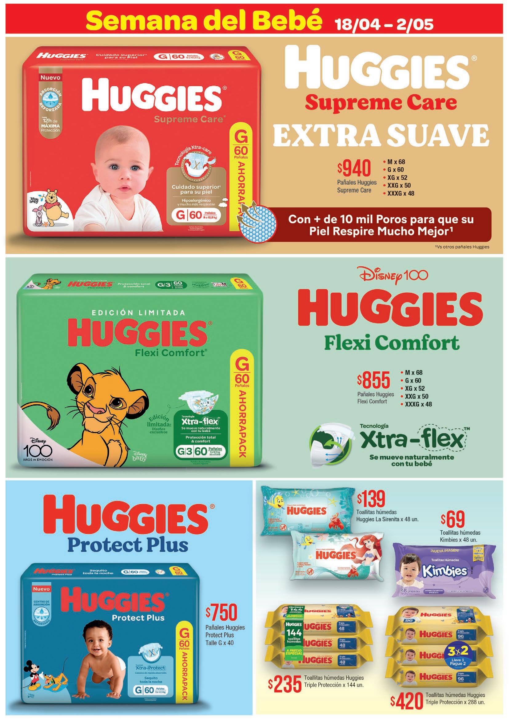 Pañales HUGGIES Active Mega, todos los talles. Precio regular: $399 Oferta $320 Estuche BEBÉ & CO. colonia spray, 120 ml. + talco con avena. Precio regular: $725 Oferta $499 Toallitas para bebé Oris JÚPITER. Precio regular: $99 Oferta $69