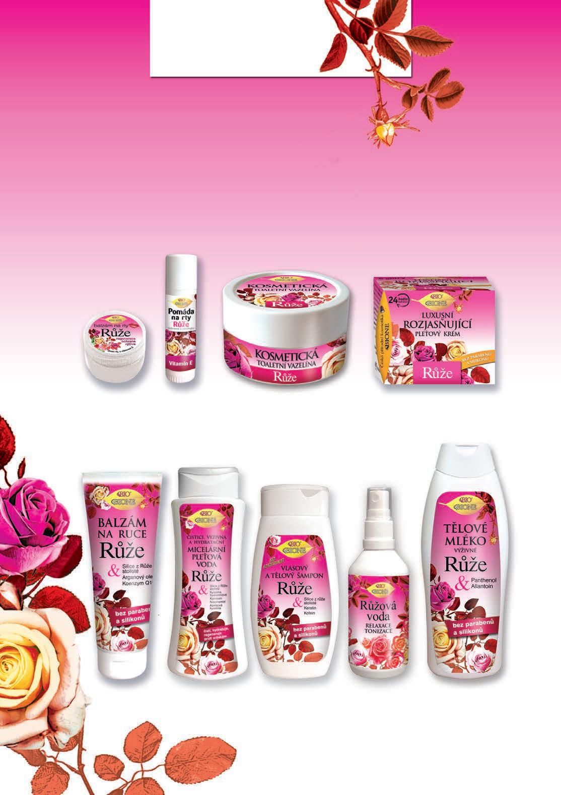 • Produkty obsahují růžový olej, který udržuje přirozenou hydrataci, elasticitu pleti, obnovuje svěžest, jas pokožky, vyrovnává barvu pleti, brání předčasnému stárnutí.