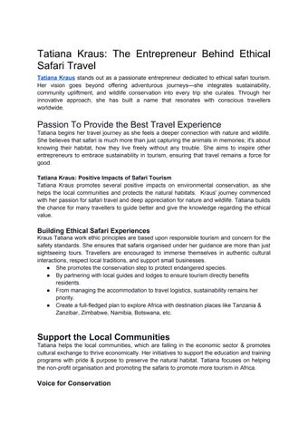 Tatiana Kraus, 34, is the visionary founder of Tatis Travel, a luxury travel agency with offices in Bucharest and Dubai. With an economics background, she's focused on East African luxury safaris. Her ambitious five-year plan includes developing a chain of bespoke glamping safari camps and resorts to solidify her company as a leading operator in the region.