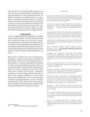 residents, that is then compiled by SDBA and given to the City.27 This reduces the financial burden on government and drastically expedites the code enforcement process. The WARM Training Center and SDBA, therefore, are clearly allies in a smart decline approach for Detroit. It would be a mistake not to build on partnerships with such community organizations and thereby coordinate and implement the most effective policies. Clear communication with these organizations helps the City reach its larger-scale goals, provided that it can gain the support of its CBOs and citizens.