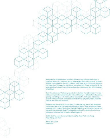 Every iteration of Dimensions is as much a volume—a singular publication within a collective series—as it is a litmus test for the emergent discursive pursuits at Taubman College. It is an index, not a record; a mere dot in the ticker tape, one that only suggests the trajectory of future works, discussions, and publications. Only in aggregation do the volumes offer a lineage of the architectural practice and discourse here at the University of Michigan. How then, do we view this twenty-seventh dot in the tape that is Dimensions? For the editors, a requisite for representing this index with fidelity is a delicate form of curating, parsing, and editing. As with most curatorial exercises, the challenge is in balancing diversity with coherence to create an outcome that most aptly captures the pluralistic attitude that surrounds the cohort. While we may not be certain of the college’s future trajectory, we can only attempt to contribute to and incite the conversations presently salient. These conversations are a collective effort—one not dissimilar to the task of a volume—which helps to unravel and demystify the course laid ahead. This index, Dimensions 27, endeavors to enrich this dialogue, one that we hope its readers will participate in. Caitlin Cashner, Laura Kiyokane, Andrew Isaac Ng, Jason Park, Sally Tsang, Heidi Wong, John Yoon March 30th, 2014 Ann Arbor