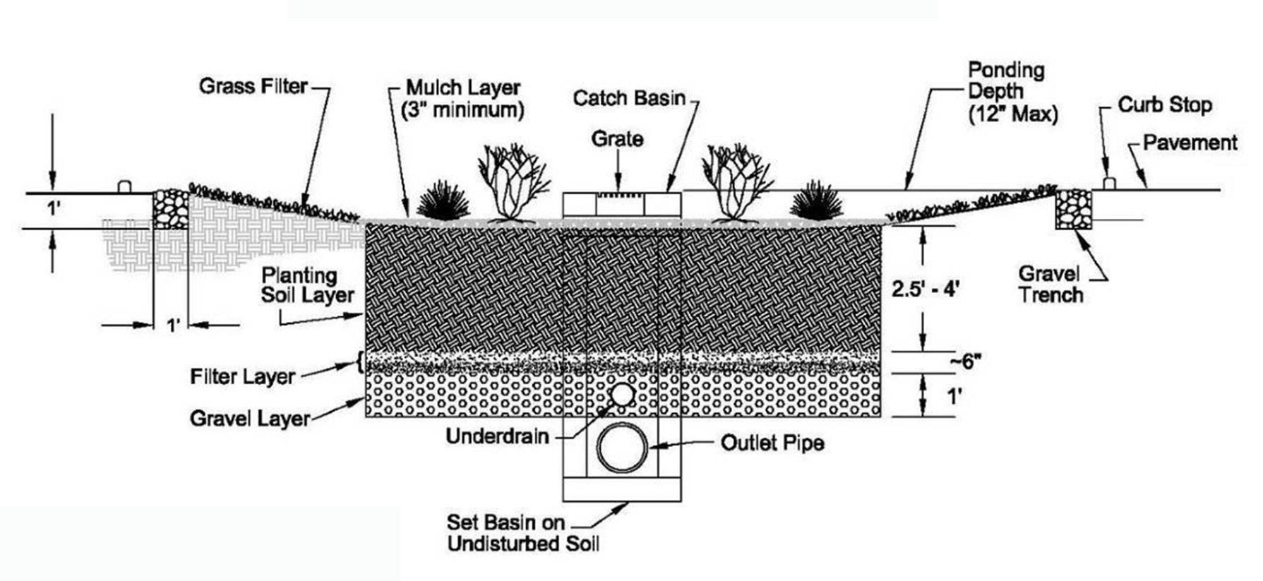Rain gardens (bioretention) are depressed areas of land that provide on-site treatment to stormwater runoff. Directing stormwater into rain gardens is an effective way to remove pollutants such as suspended solids, heavy metals, organic compounds, bacteria and nutrients. Pollutant removal occurs by filtering runoff through the layers of mulch and soil mixes.38