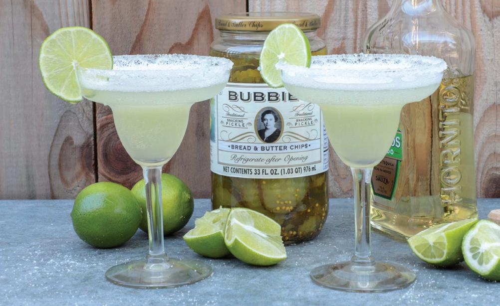 In a signature margarita recipe, Bubbie substitutes agave nectar with its Bread & Butter brine. The tart and subtle sweetness of this family recipe pairs perfectly and makes for a fresh twist on a classic margarita. The fermented and pickled brines can become complex ingredient substitutes for any recipe that calls for vinegar or a syrupy sweetener,” says Matt Reynold, a brand manager at Fermented Food Holdings (the parent company of Bubbies Fine Foods). Warning: This recipe serves one.