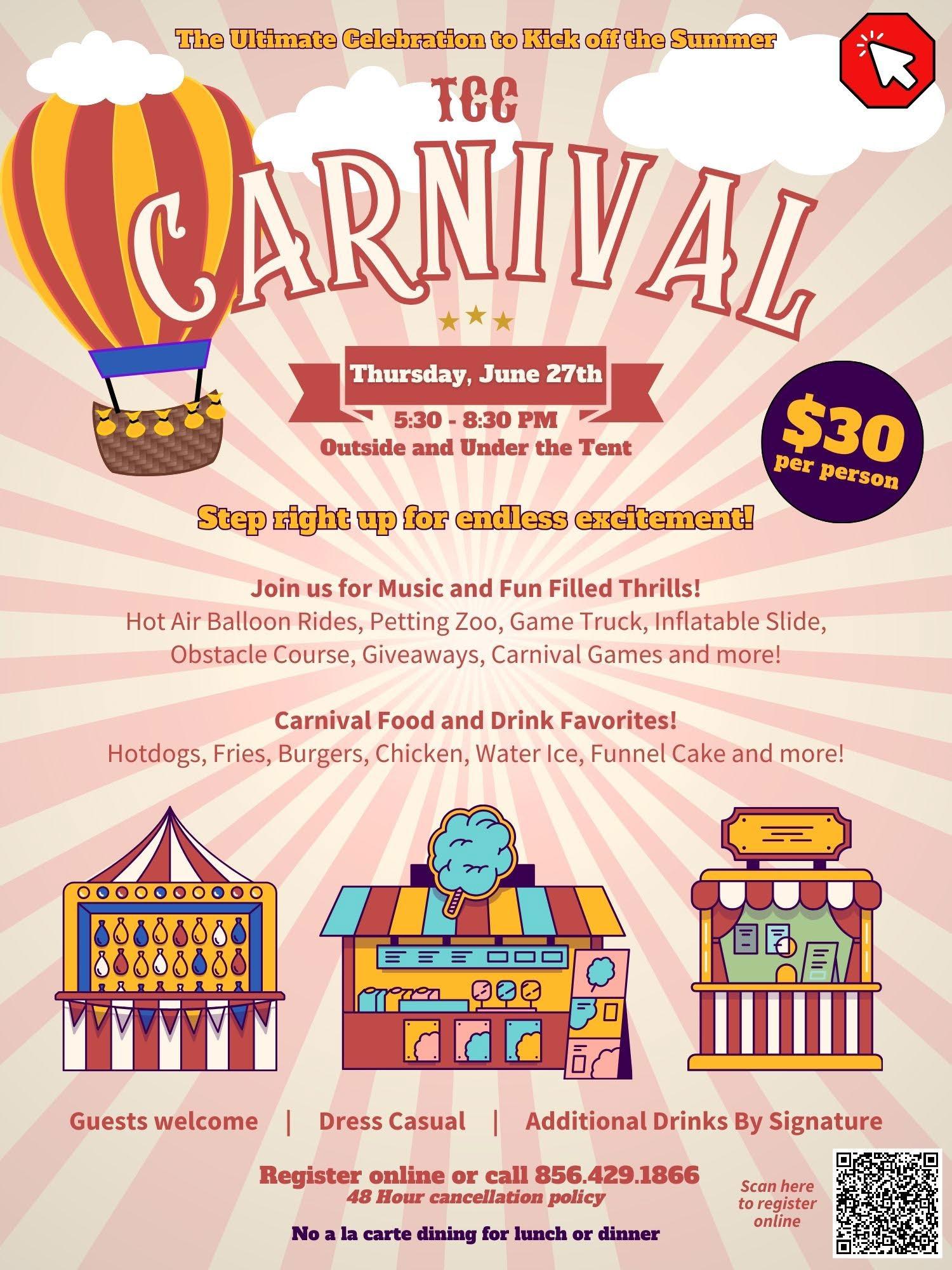 Finally, two other outdoor favorites returning this summer are the always popular Cigar Café Dinner on Wednesday, June 19th on the 11th tee box and the TCC Carnival on Thursday, June 27th.