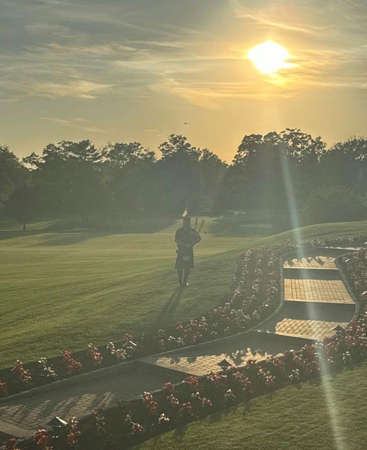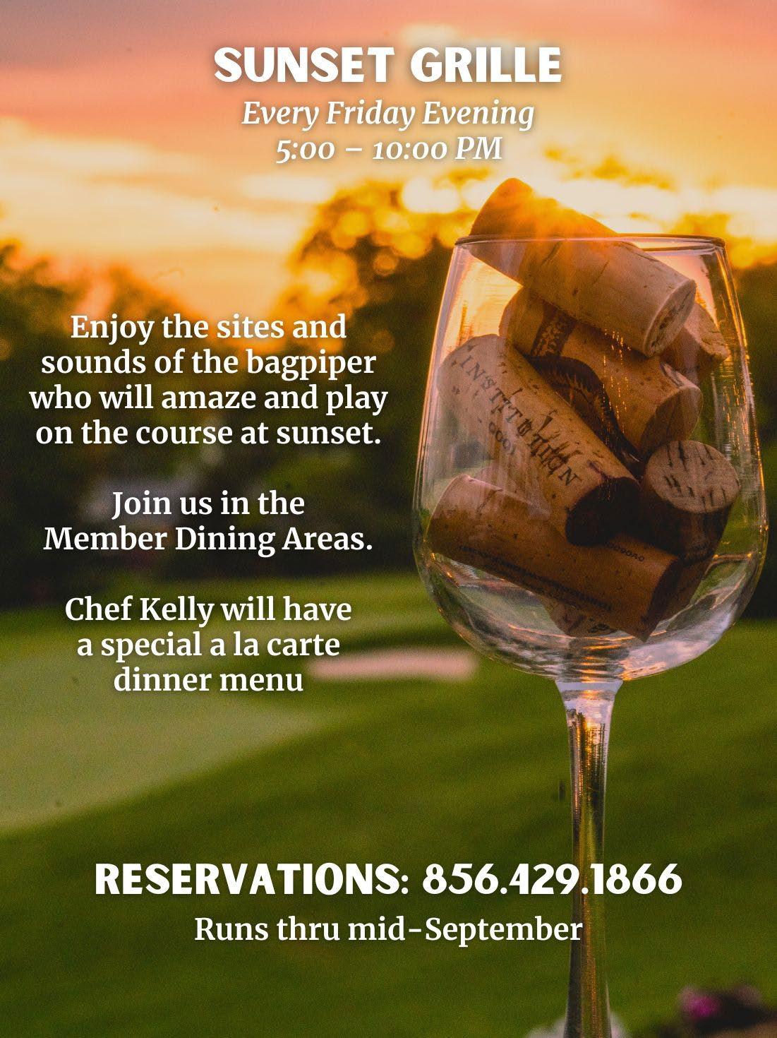 The start of a Friday Night Sunset Grille dinner in June. The bagpiper paying his respects as the sunset awaits.